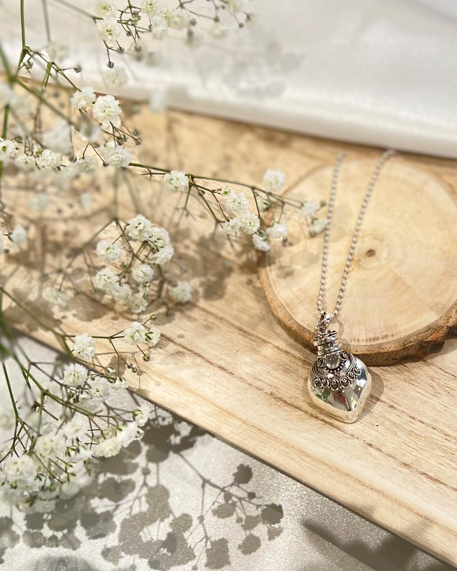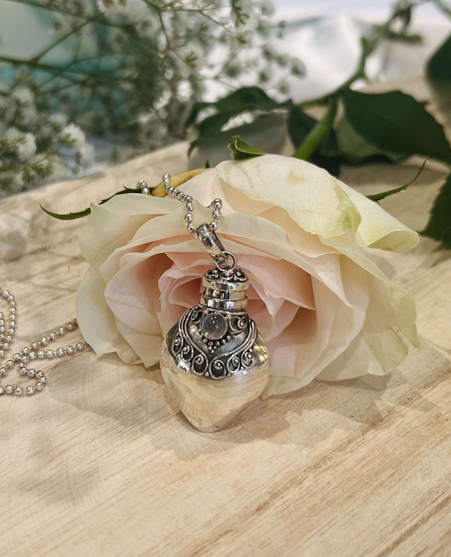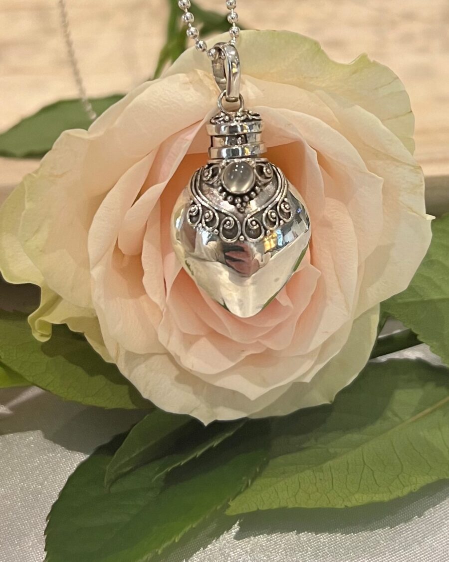 Wensdoosje ook wel ‘Gebedsdoosje’ genoemd afkomstig van Bali. Gemaakt van sterling zilver (925) in de vorm van een flesje. De prayerbox is versierd met een melkwitachtige maansteen edelsteen. Het doosje kan dicht en je kunt er iets dierbaars in bewaren of iets ter herinnering. De ketting (Rolo 3mm) op foto wordt niet meegeleverd, maar kun je wel direct me bestellen. We hebben diverse kettingen in ons basis assortiment.